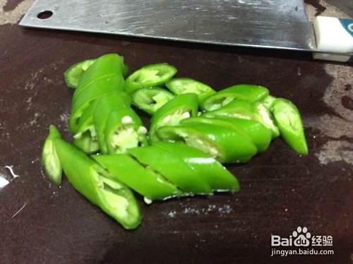 青椒洗净、去蒂,斜刀切成1厘米左右宽的橢园圏。