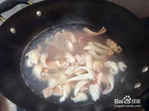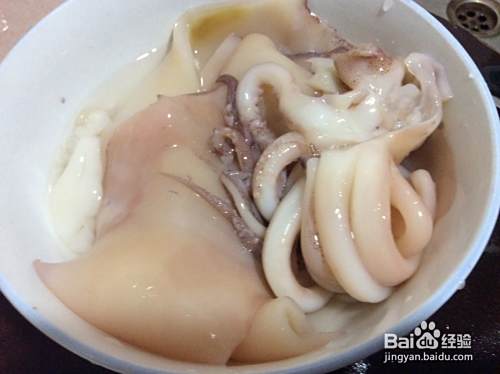 将鱿鱼全部倒入开水中,煮开,鱿鱼片就变成美丽的鱿鱼卷了,煮开后再煮1分钟左右就熟了。捞出沥干水分晾凉。(焯过水的鱿鱼水分少些)。