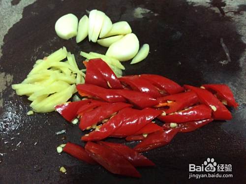 泡红辣椒斜刀切成5毫米左右宽的橢园圏;泡姜切成姜丝;蒜去皮,切成片。