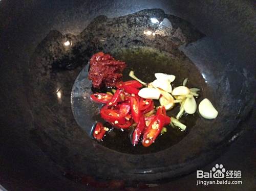 铁锅放入食用油,开火,烧热,加入泡姜、泡椒、蒜、豆瓣酱,炒香。