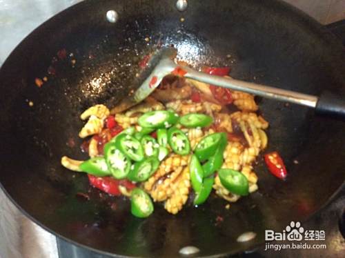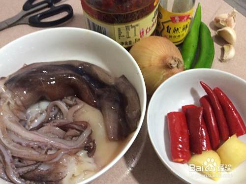 准备食材:鱿鱼、洋葱、青辣椒、泡红辣椒、泡姜、蒜。