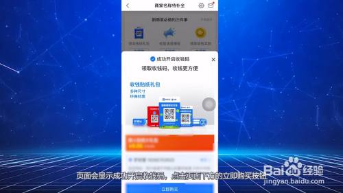 页面会显示成功开启收钱码,点击页面下方的立即购买按钮,领取收钱码贴纸礼包即可。