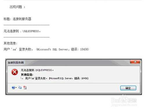 标题: 连接到服务器------------------------------无法连接到 .\SQLEXPRESS。------------------------------其他信息:用户 'sa' 登录失败。 (Microsoft SQL Server,错误: 18456)