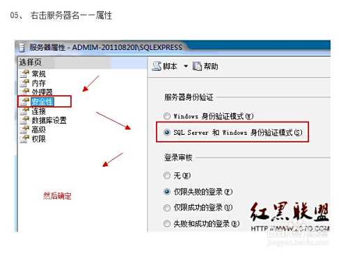 安全性——选中 SQL Server 和 Windows 身份验证模式——确
