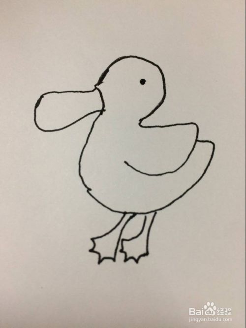 接下来,再画出鸭子小小的眼睛和大大的双脚。小鸭子就完成了。