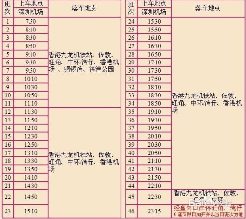 时 刻 深圳机场——香港机铁九龙站:09:0—22:30,每30分钟一班,繁忙时间每15分钟一班,周五及节假日增加23:00及23:30两班 香港机铁九龙站——深圳机场:7:15—18:45,每30分钟一班