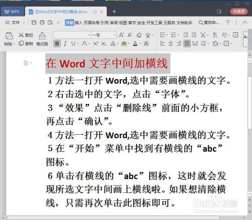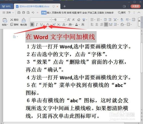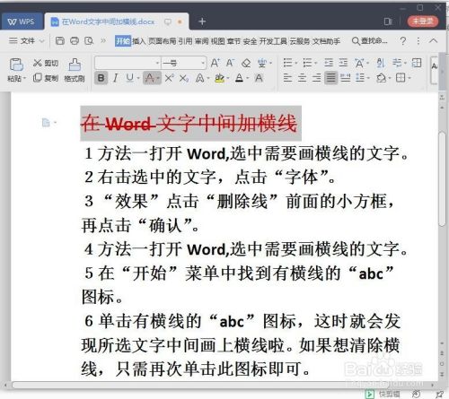 单击有横线的“abc”图标,这时就会发现所选文字中间画上横线啦。如果想清除横线,只需再次单击此图标即可。