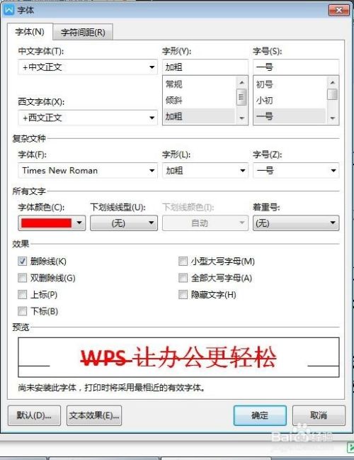 “效果”处找到“删除线”。点击“删除线”前面的小方框,再点击“确认”按钮,这样所选文字中间就画上横线啦!