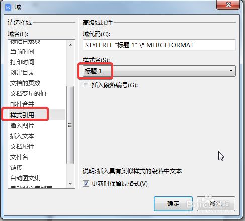 弹出一个【域】的对话框,我们在左侧的【域名】中选择“样式引用”,在右侧【样式名】中选择“标题1”,点击确定,如下图所示: