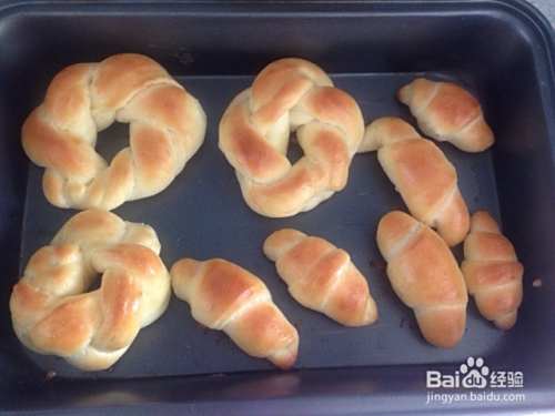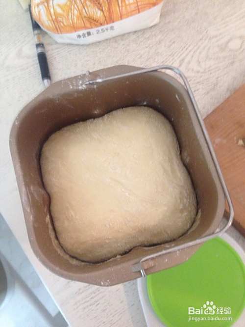先放入牛奶和液体 在最底下 再放入糖、奶粉 盐放在一个角落 之后再放入高筋面粉 在面粉上挖一个小凹槽 放入酵母粉 酵母粉与放盐的位置要对角放 然后在面包机上选择“和面”选项 大约10-15分钟后 放入切成小碎块的黄油 继续和面 成手膜状结束。再选择发酵使面团膨胀2倍拿出 中间戳一个小洞 排气取出。