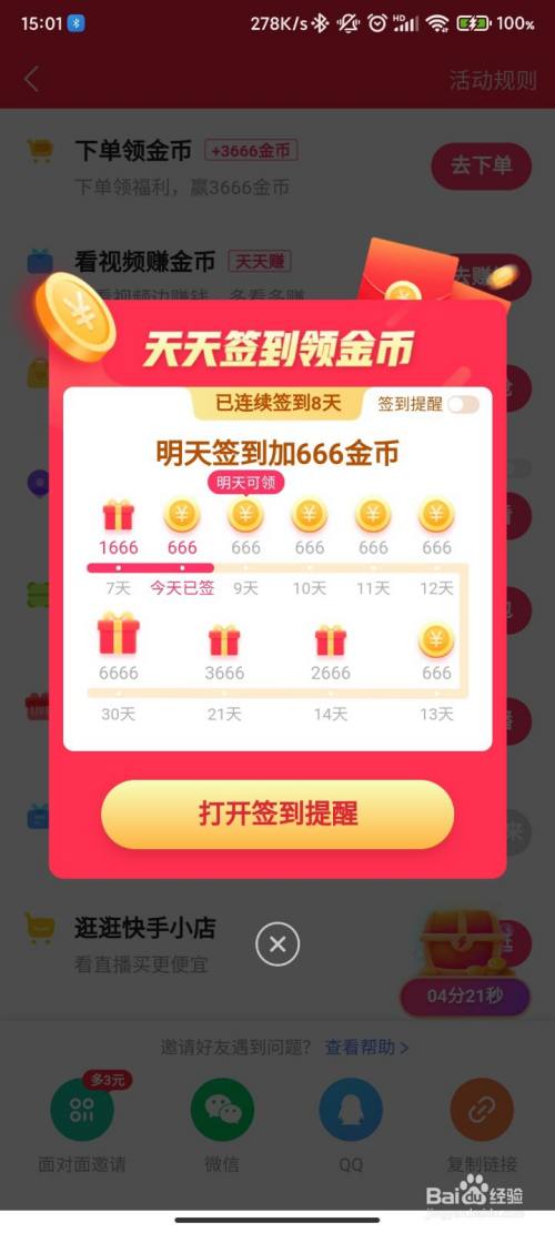 只要打开软件自动弹出签到页面,点击签到即可完成签到。