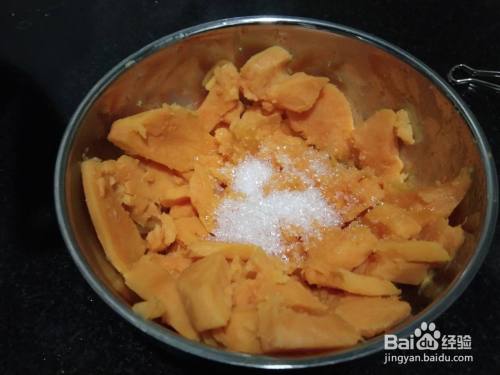第二步,蒸熟之后放入一勺白糖,用勺子捣碎,搅拌白糖融化。