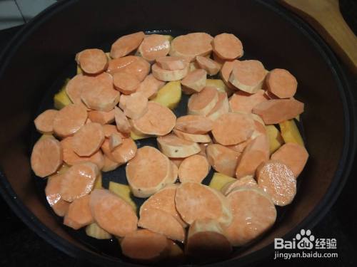 第一步,我们准备好一根红薯,削皮洗干净切成块放入蒸锅中蒸熟。