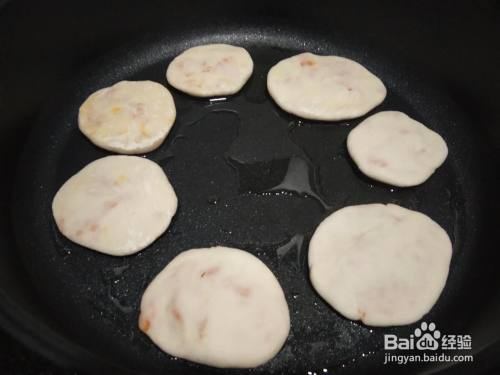 第六步,锅里加入食用油,把红薯馅饼排列好小火慢煎。
