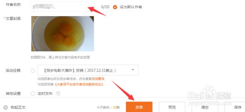 填写好作者的名称,封面最好选择正文里的图片,只能是单张。别的也是按照提示来操作。最后点一下发表即可。如图所示。