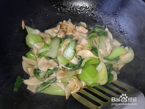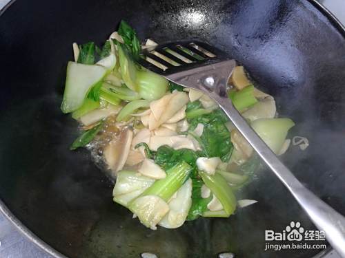 杏鲍菇翻炒几下后,将油菜倒入锅中继续翻炒。