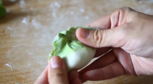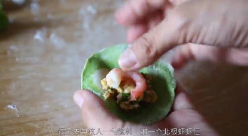 31饺子皮中加入馅料和一个北极虾虾仁。