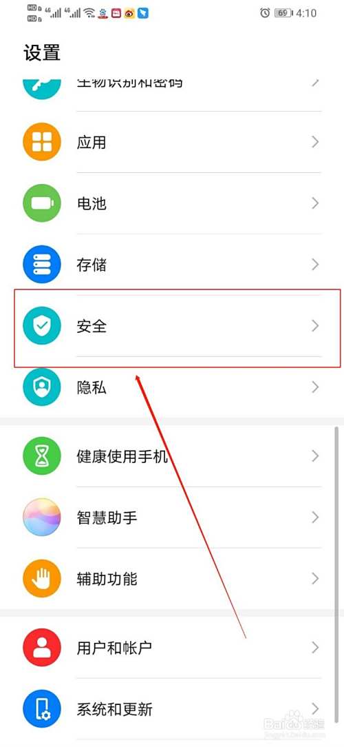 在“设置”中,向上滑手机,找到“安全”,如图