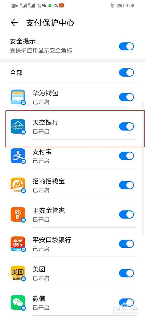 华为手机如何关闭天空银行的支付保护中心