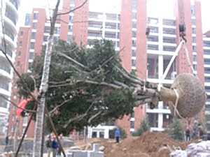 在选择吊装支点的树干位置,绑一圈薄、窄木板或竹板,以免在吊装时损伤树皮。启运前对全树喷一次“抑制蒸腾剂”,减少运输过程中水分的流失。准备好雨布,以便在运输过程中下雨时遮盖土球,使其不至于被雨水淋软或淋垮。但不能全程盖雨布,因为若遇高温天气,尤其是在汽车停止运动时,雨布覆盖的小环境内会急剧升温,加速蒸发而导致树脱水死亡。
