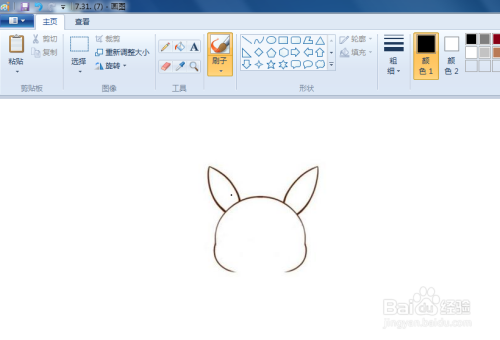 然后再两个耳朵的顶吧,画两个斜线,并且把那个一部分涂黑,把他的眼睛还有嘴巴画出来,