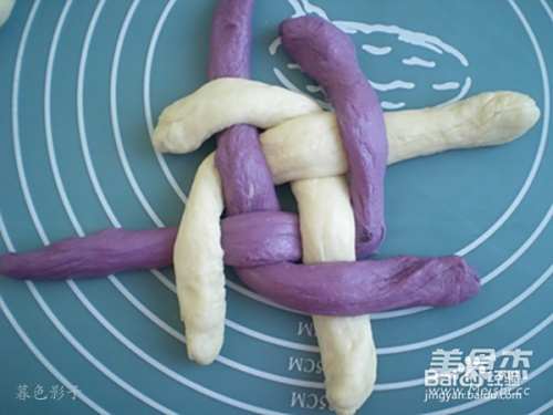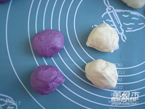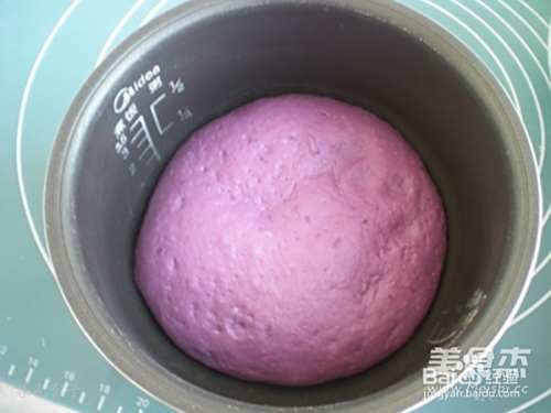 4熟紫薯泥、牛奶100ML、酵母粉3G混合面粉(250G)发酵、发酵好的紫薯面团排气、