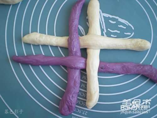 66二个颜色各取一团面分成二份、搓成面条。摆放成#子