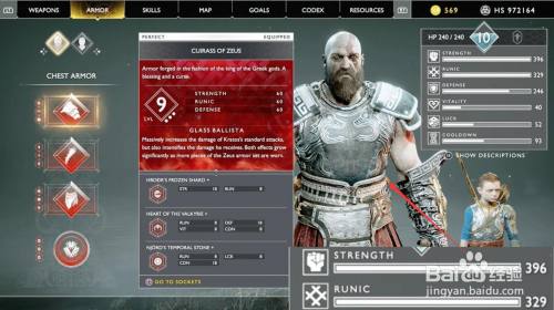 第三件装备是奎托斯-宙斯护甲,宙斯护甲是游戏中属性最好的护甲,而且只能在二周目中获取。每件装备都有3个咒术插槽,