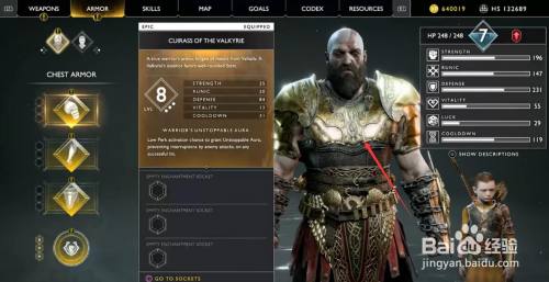 第一件装备是奎托斯-女武神护甲在一周目中,女武神护甲套装(史诗品级)很好用,这套装备能够极大地提升力量、防御、卢恩符文和冷却性能。获得方法是女武神胸甲——击败尼福尔海姆的女武神希露德后获得,女武神铁手套——击败穆斯贝尔的击败女武神格恩达尔后获得,女武神护腰——击败亚尔夫海姆的女武神奥尔露恩后获得。