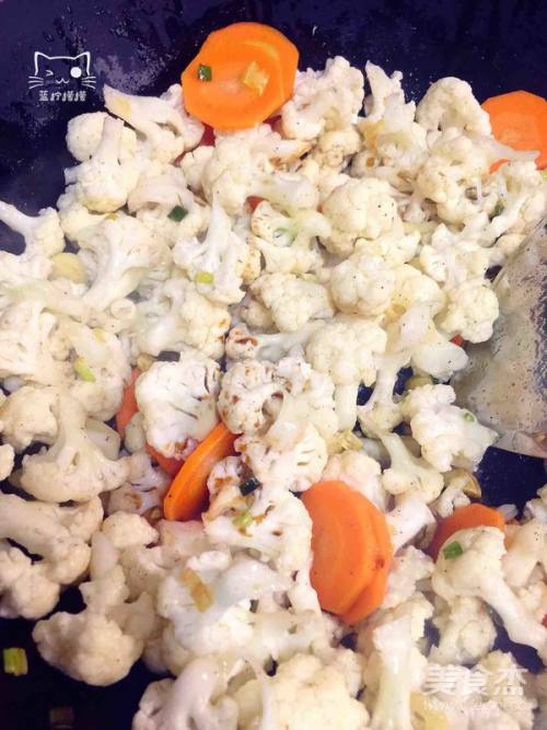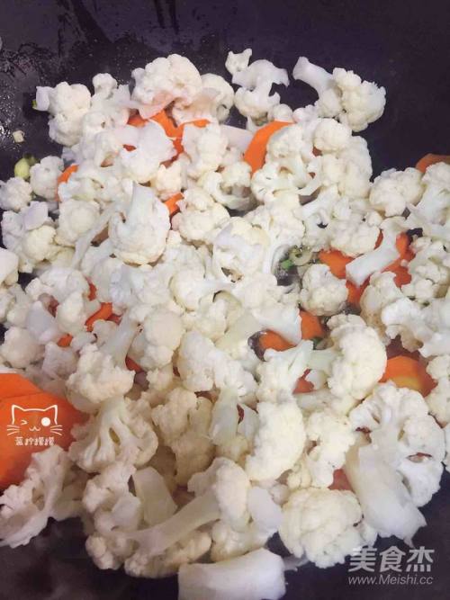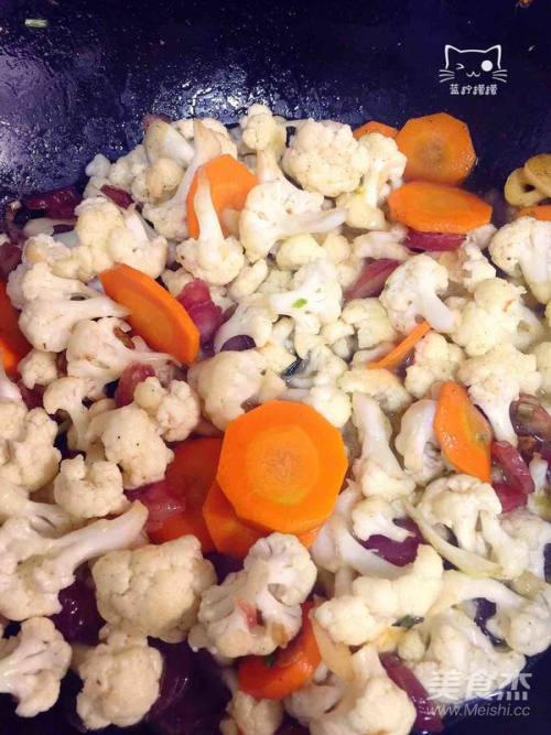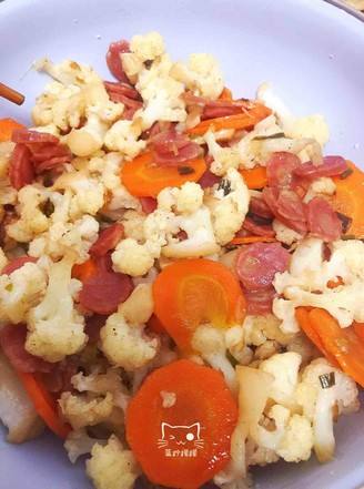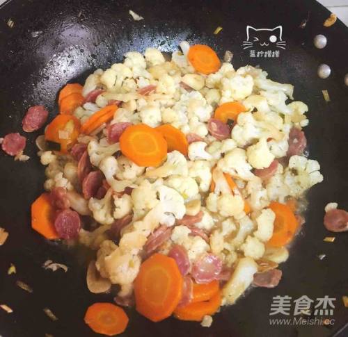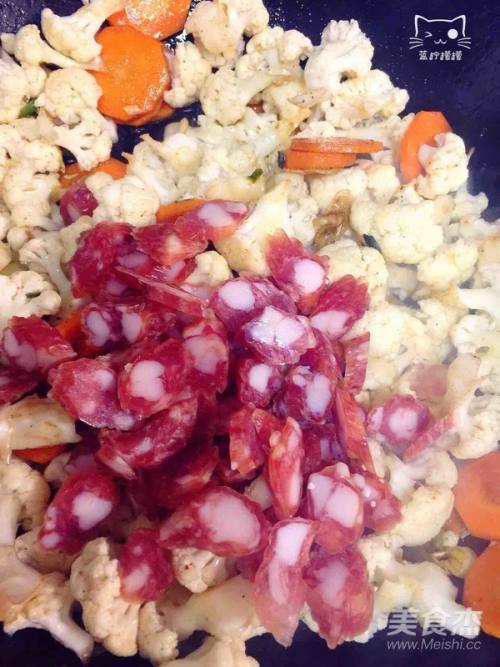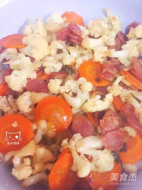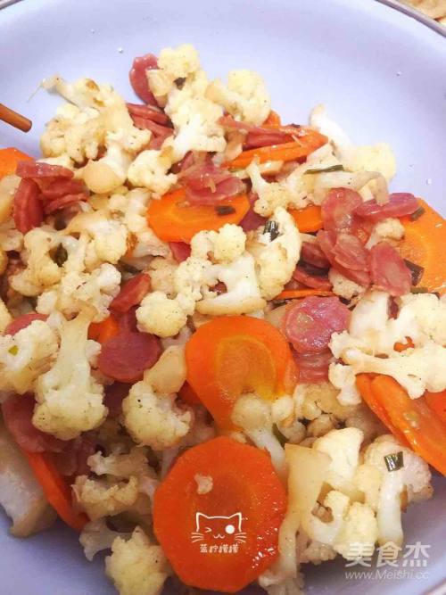 1菜花(花菜/花椰菜)洗净掰小朵,胡萝卜洗净削皮切片,腊肠切片,葱蒜切碎