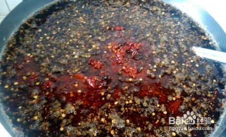 加入打细的碎米芽菜,豆豉,豆瓣酱,辣椒,花椒,中火熬半小时。