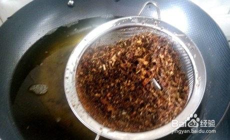 9、将熬好的香料锅里的油过滤到牛油锅里。