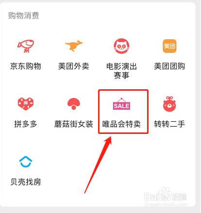 在“购物消费”栏中,找到“唯品会特卖”,如图所示。