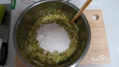 将面粉加进搅拌好的菜盆里,切记不要一次性把面粉倒进盆里,要一点一点的加,边加面粉边搅拌,直到搅拌成均匀的面糊糊状态