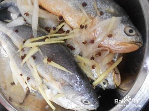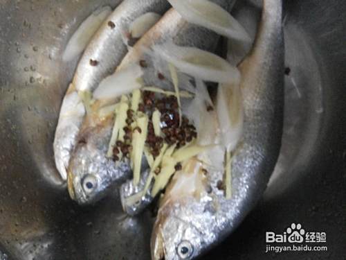 把切好的葱丝,姜丝 花椒撒到鱼上,倒入盐,料酒拌匀。
