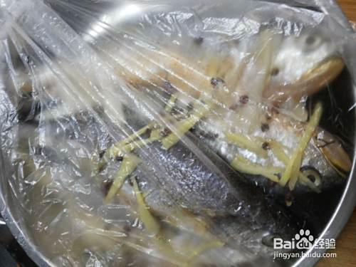 把调料在鱼身上均匀地抹匀后,盖上保鲜膜,入味半小时。