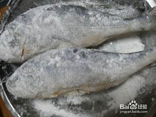 把鱼身上的调料剔除,控净水分。在盘内加入面粉均匀的裹在鱼身上。