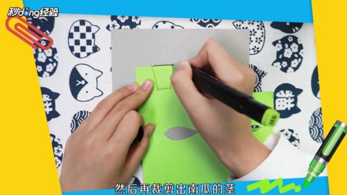 6把黄色卡纸裁剪出两个长条,粘贴在南瓜的两边。