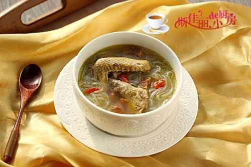 鸽子汤煮好后加入泡软的红薯粉丝, 继续煮上五分钟;