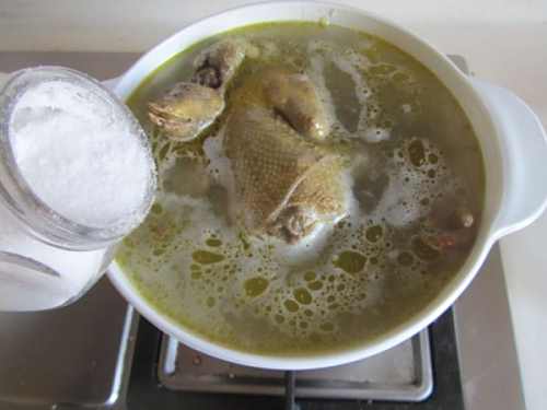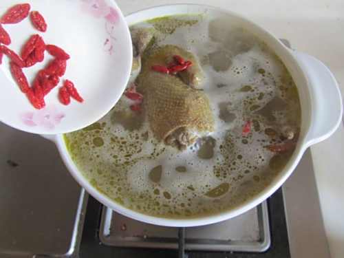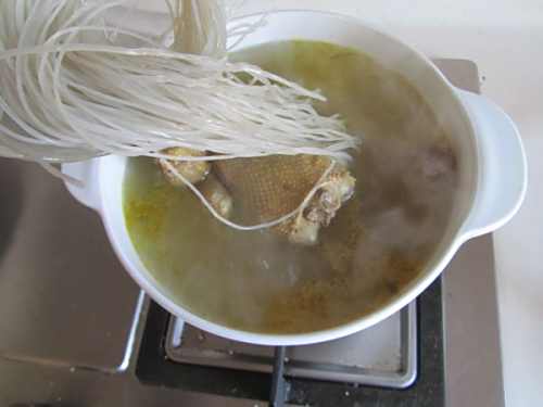 7鸽子汤煮好后加入泡软的红薯粉丝, 继续煮上五分钟;
