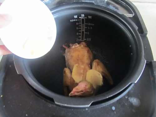 将煎好的鸽子放入煲中, 放入天麻和姜片;