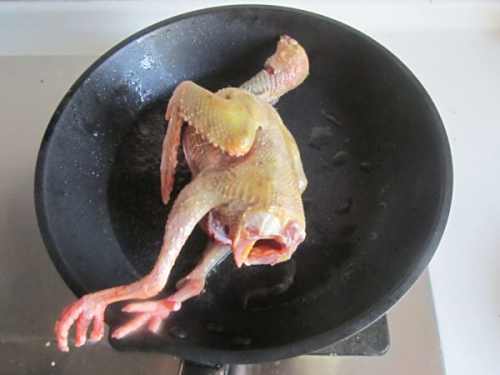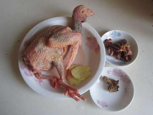 3将煎好的鸽子放入煲中, 放入天麻和姜片;