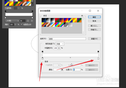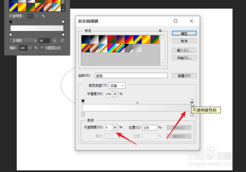 点击右侧的不透明度设标之后,在下图箭头所指处,将数值设置为0。形成渐变。