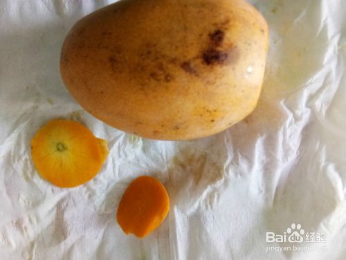 用小刀把芒果的头和芒果蒂的位置分别切掉,如图。切的时候一定要小心哦。