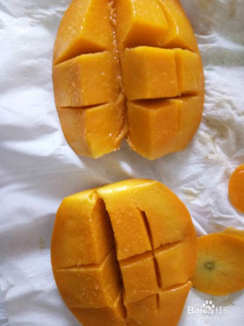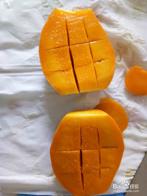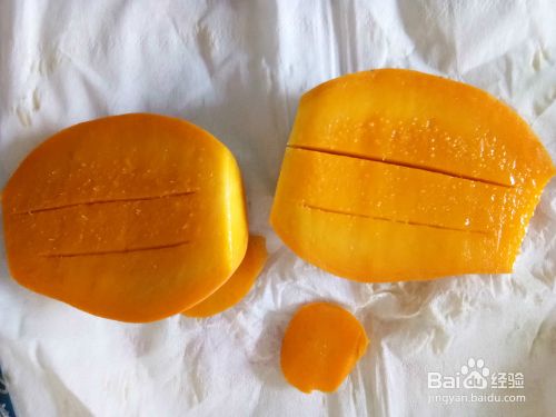 在芒果肉的上面横着划两刀。看芒果的大小,大的话,可以多划几刀。另外一个也一样操作。
