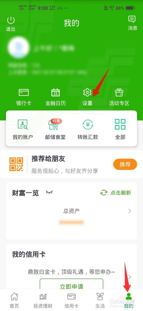在手机上打开邮储银行,点击右下角的我的选项,再点击设置的图标。