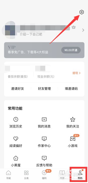 登录番茄小说APP,进入“我的”,点击右上角的设置图标。