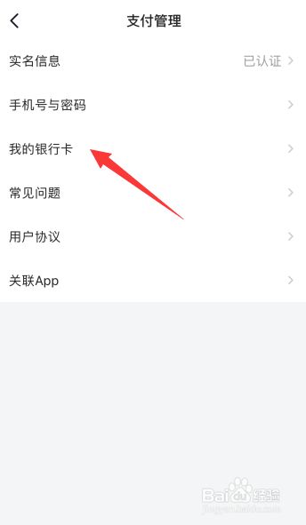 在下一个页面,点击“支付管理”。进入支付管理页面,点击“我的银行卡”。