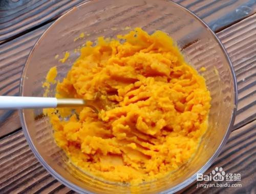 第一步,红薯事先洗干净,削去皮,将红薯切成片或者是小块,隔水放入锅中,蒸大概15分钟,将红薯蒸熟后,盛出来,用勺子压成泥;