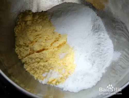 第二步,玉米面和糯米粉准备出适量,混合后,最好可以过一遍筛子,将面粉加入在红薯泥中,再加上点白糖,加入50克的清水,一边加水一边搅拌;